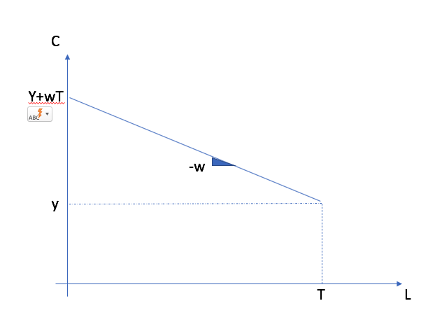 When she works, the consumer has an hourly wage \(w\) and other income \(y\). If she works \(H=T\) hours, she has a full income of \(I = w T + m\). She implicitely spends on two goods she consumes, \(C\) and \(L\). Leisure has the opportunity cost per hour worked given by \(w\). The budget constraint is given by: