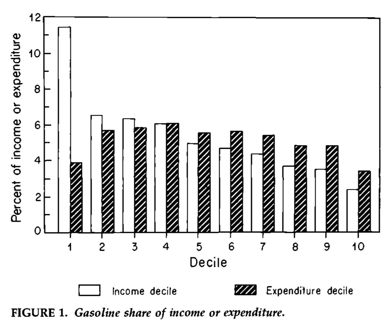 Who spends more on gasoline? One study by James Poterba (1991) suggests that the gasoline budget share is decreasing if we divide by income but not if we divide by all spending. The reason has to do with variation in how one defines disposable income (if for example one consumes out of savings).