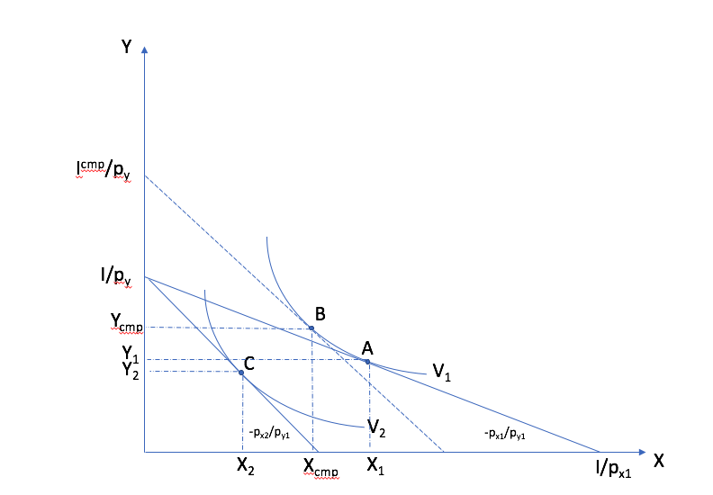 Compensated Income: income \(I^{cmp}\) such that we maintain utility at reference levels despite facing new prices.