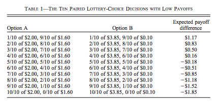 How do we measure this coefficient? One method is the multiple price list (MPL). Holt et Laury (2002) have used MPLs to measure risk attitudes.