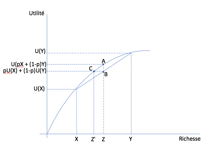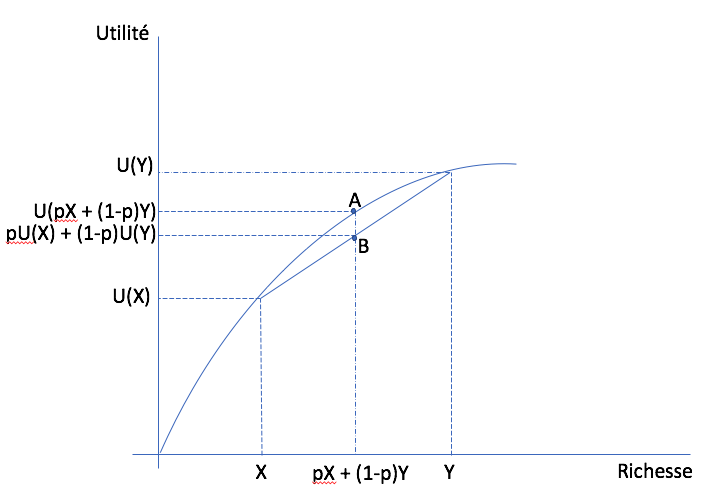 In the wealth-utility space, consider a lottery on \((X,Y)\) with probability \(p\) that \(X\) is realized. Starting on the horizontal axis, expected wealth is between \(X\) and \(Y\) since \(p\) is between zero and one. On the vertical axis, we can also do the same thing for expected utility, with the same \(p\). Varying \(p\), we get the straight line that attaches points \((X,Y)\) to the utility function. Since the function is concave, this line (or cord) is below the function itself. So utility evaluated at expected wealth (point A) is always above expected utility (point B). This holds for all \(p\).¶